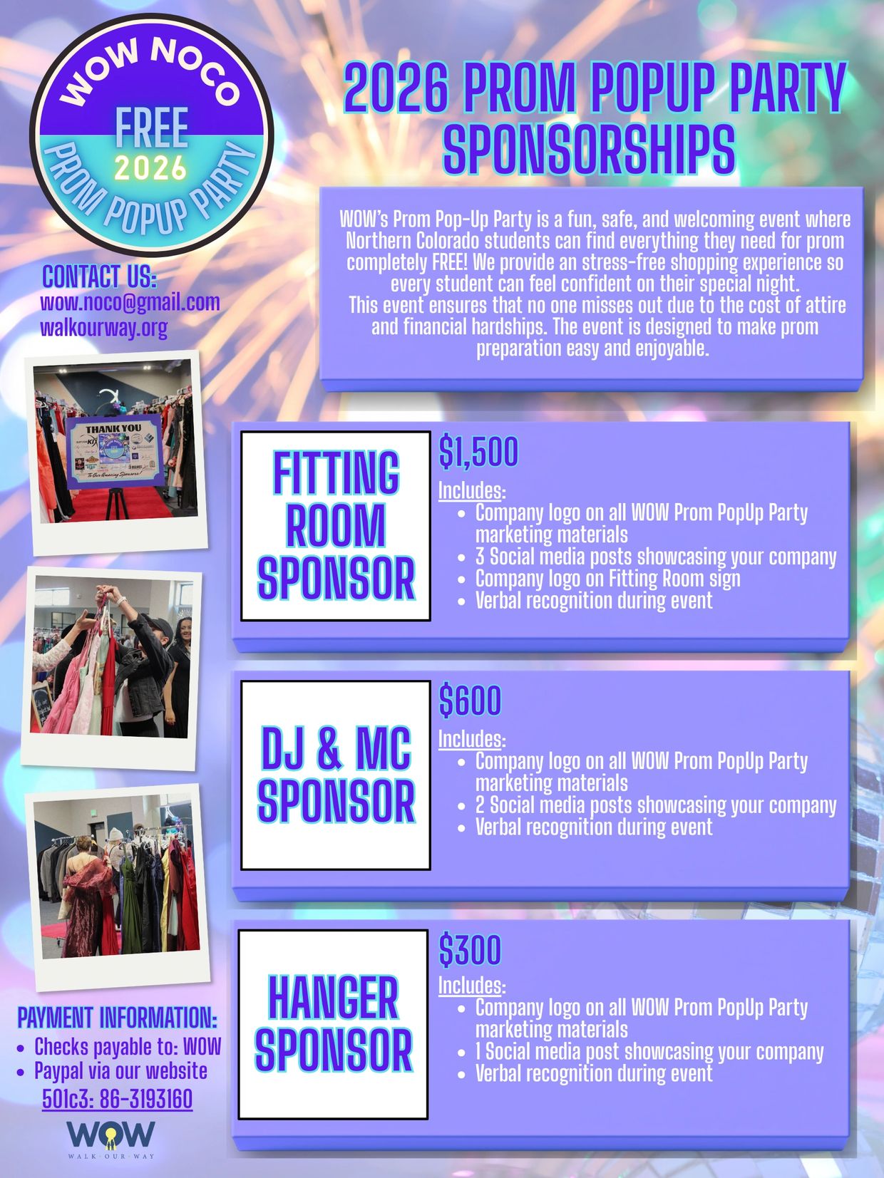 WOW’s Prom Pop-Up Party is a fun, safe, and welcoming event where Northern Colorado students can find everything they need for prom—completely FREE! From stylish gowns and suits to accessories, we provide an stress-free shopping experience so every student can feel confident on their special night. This event ensures that no one misses out due to the cost of attire and financial hardships.